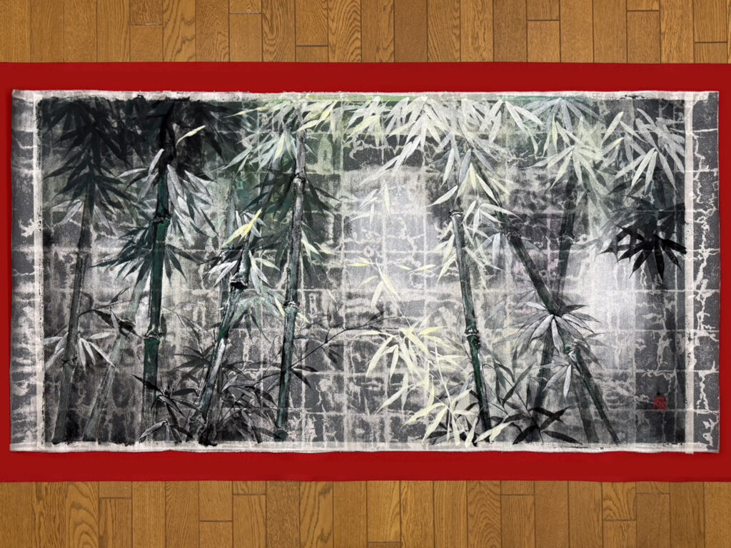 今回は以前の作品のような墨濃淡ではなく、春の息吹を感じさせる緑と青色を取り入れ、竹の柔らかな風合いを表現しています。